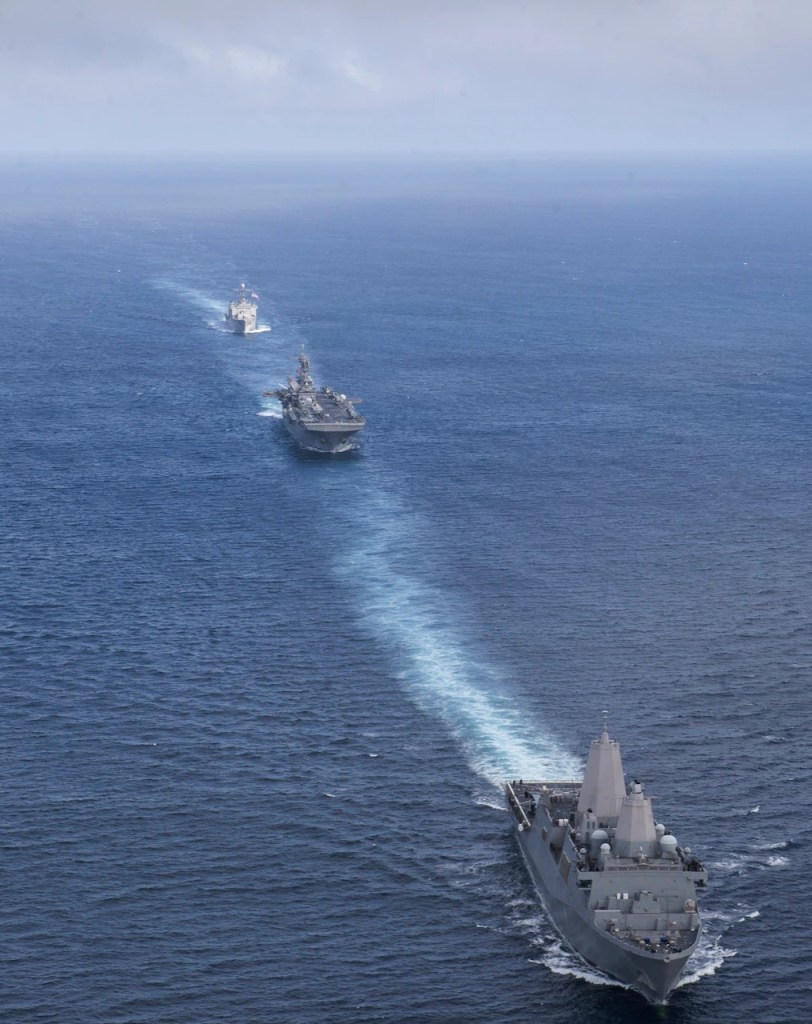 An amphibious assault ship, an amphibious transport dock, and a dock landing ship — working together to deliver Marines, vehicles, aircraft, and landing craft from sea to shore. Coordination between ships, aircraft, and landing forces for precise operations. Quick-response capability for crises both ashore and at sea.